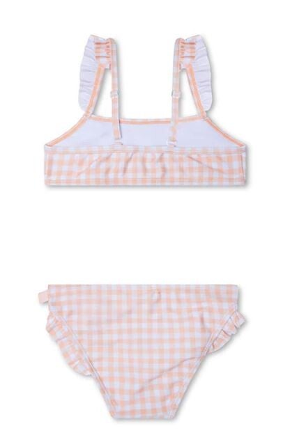 De bikini is volledig UPF50+, wat zorgt voor optimale bescherming tegen de UV-straling van de zon. Deze meiden bikini bevat een leuke print met oranje vierkantjes.